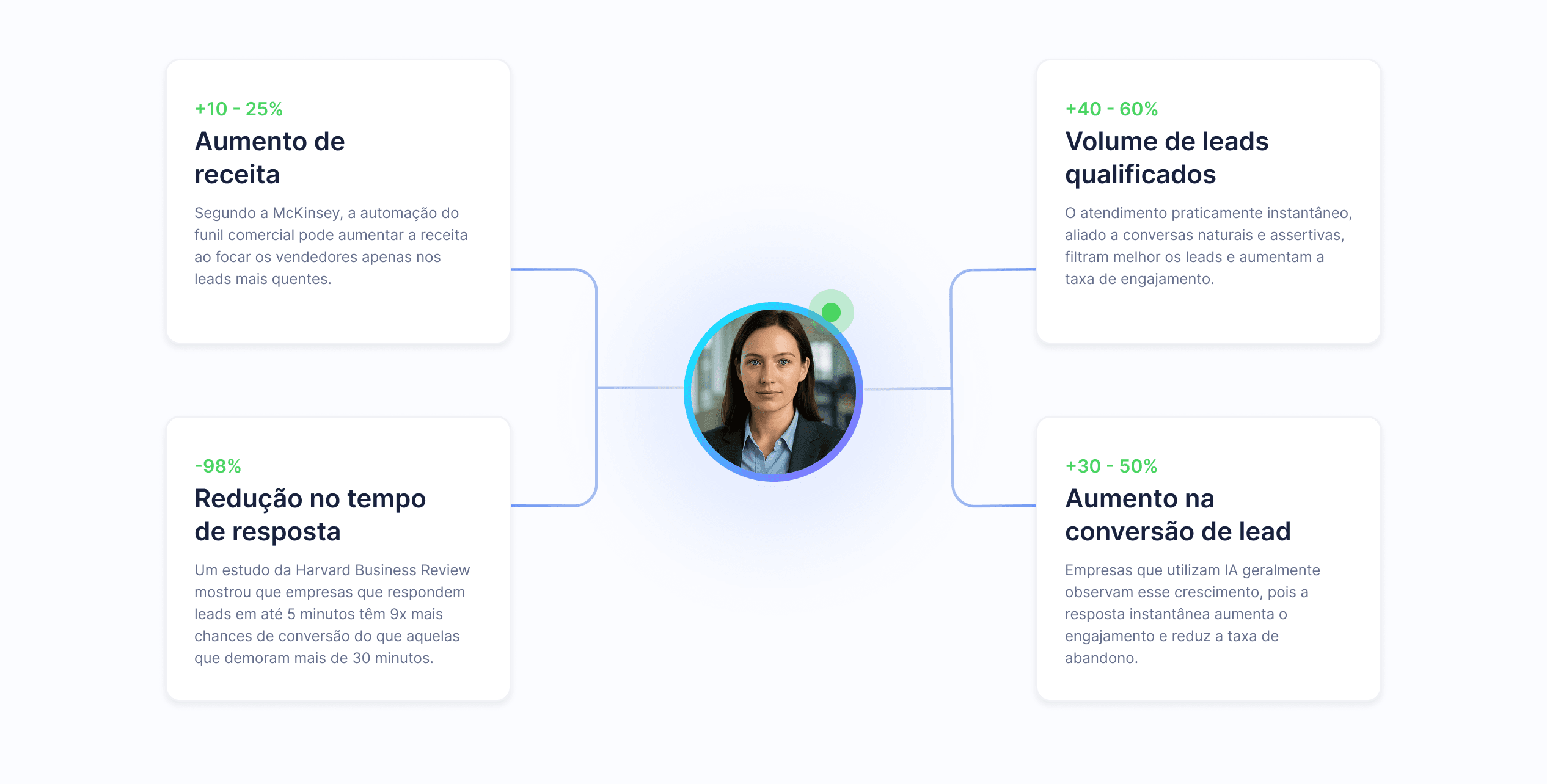 Menos tempo de espera para o lead. Mais cobertua fora de horários comerciais, finais de semana e feriados.